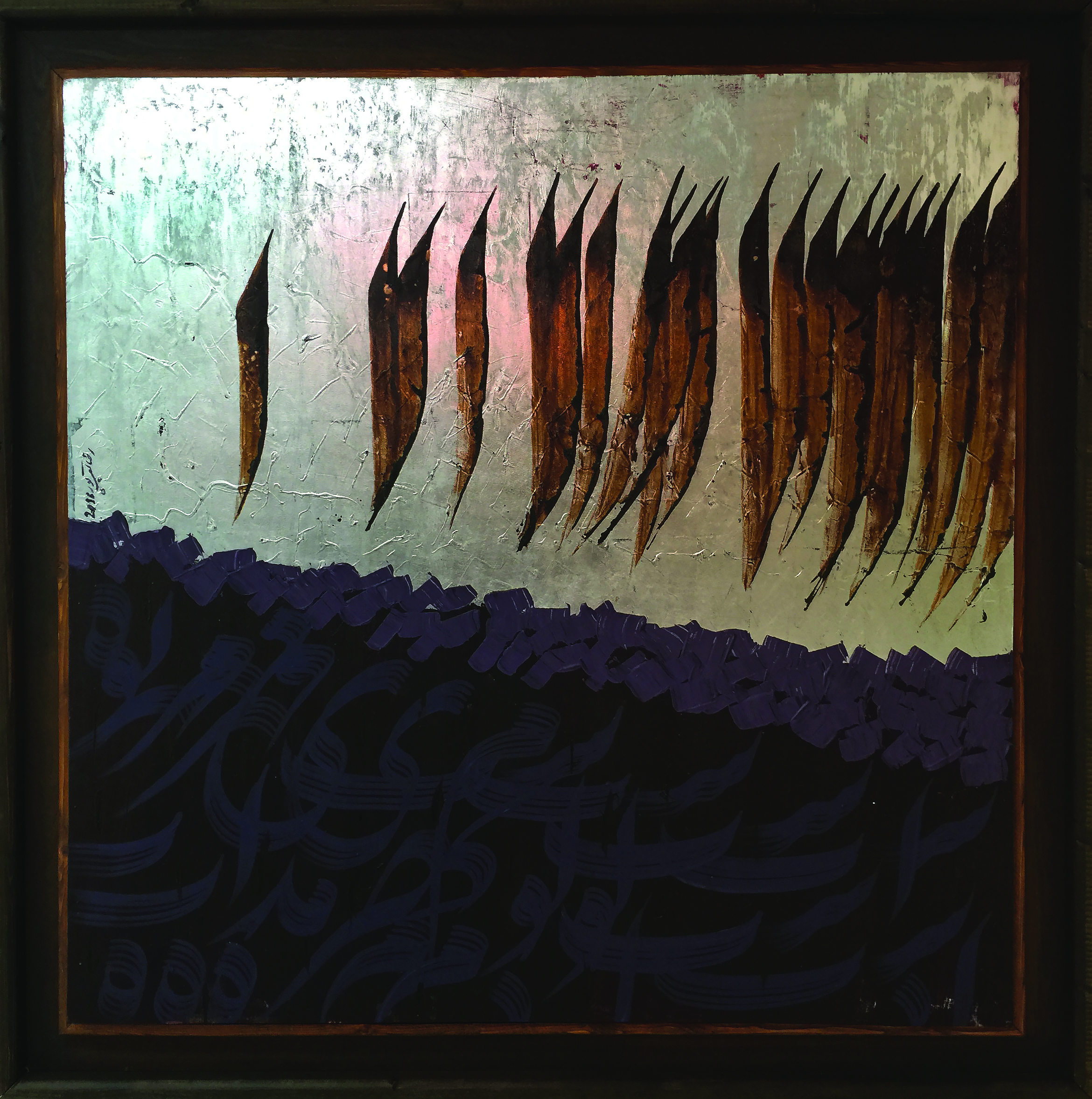 Untitled, calligraphy-painting inspired by nature; a combination of modern paintings and Iranian calligraphy, date: 2016, medium: acrylic on wood, size: 100*100 cm