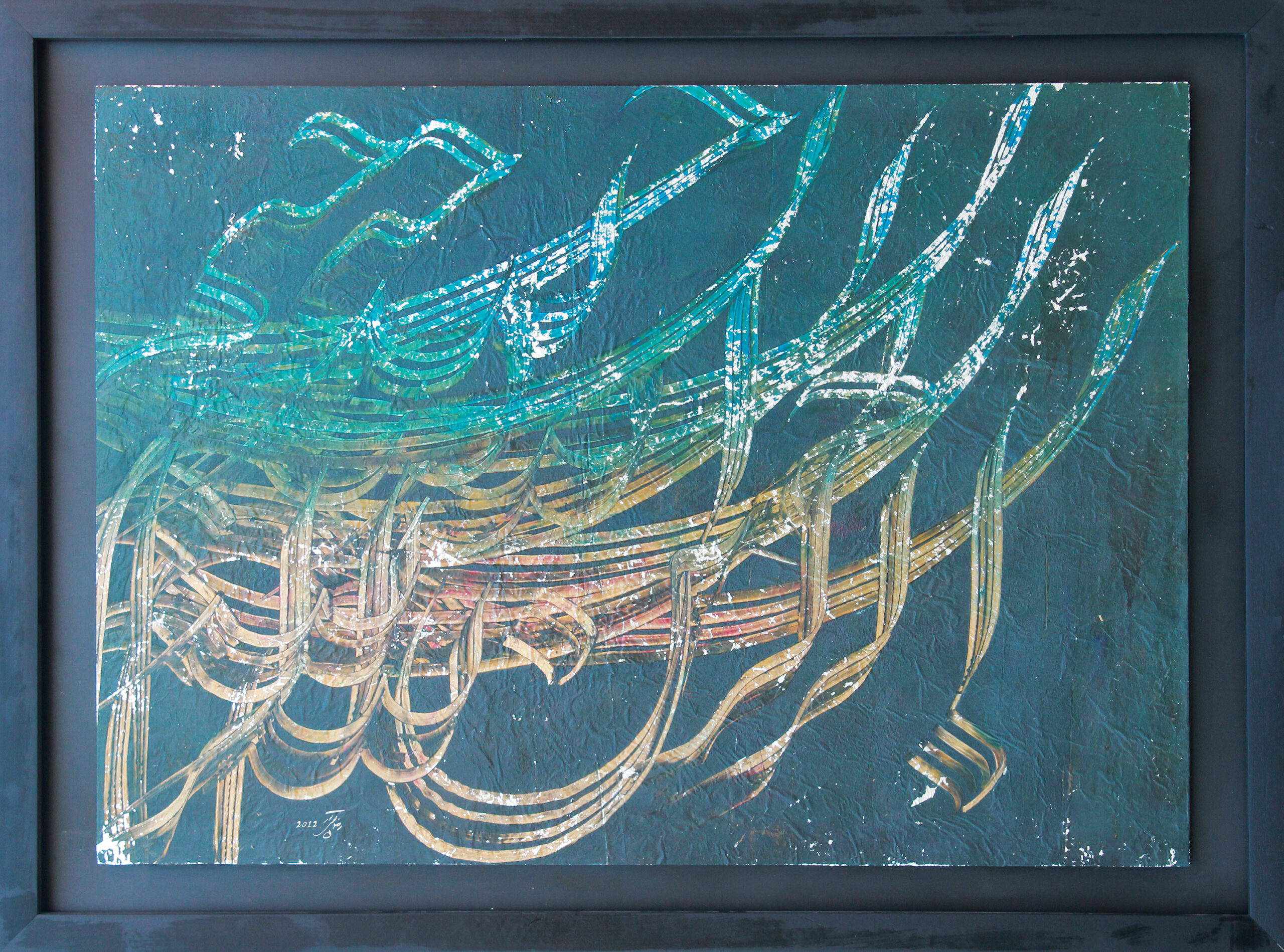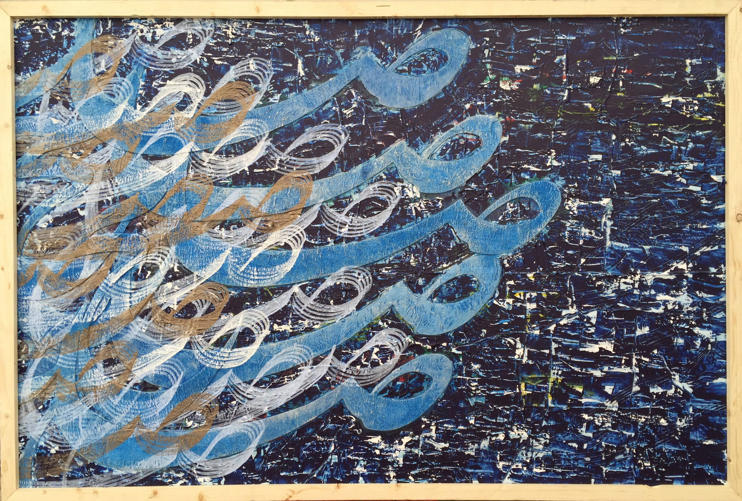 Riverbed, calligraphy-painting inspired by nature; a combination of modern paintings and Iranian calligraphy, date: 2016, medium: acrylic on canvas, size: 50*70 cm