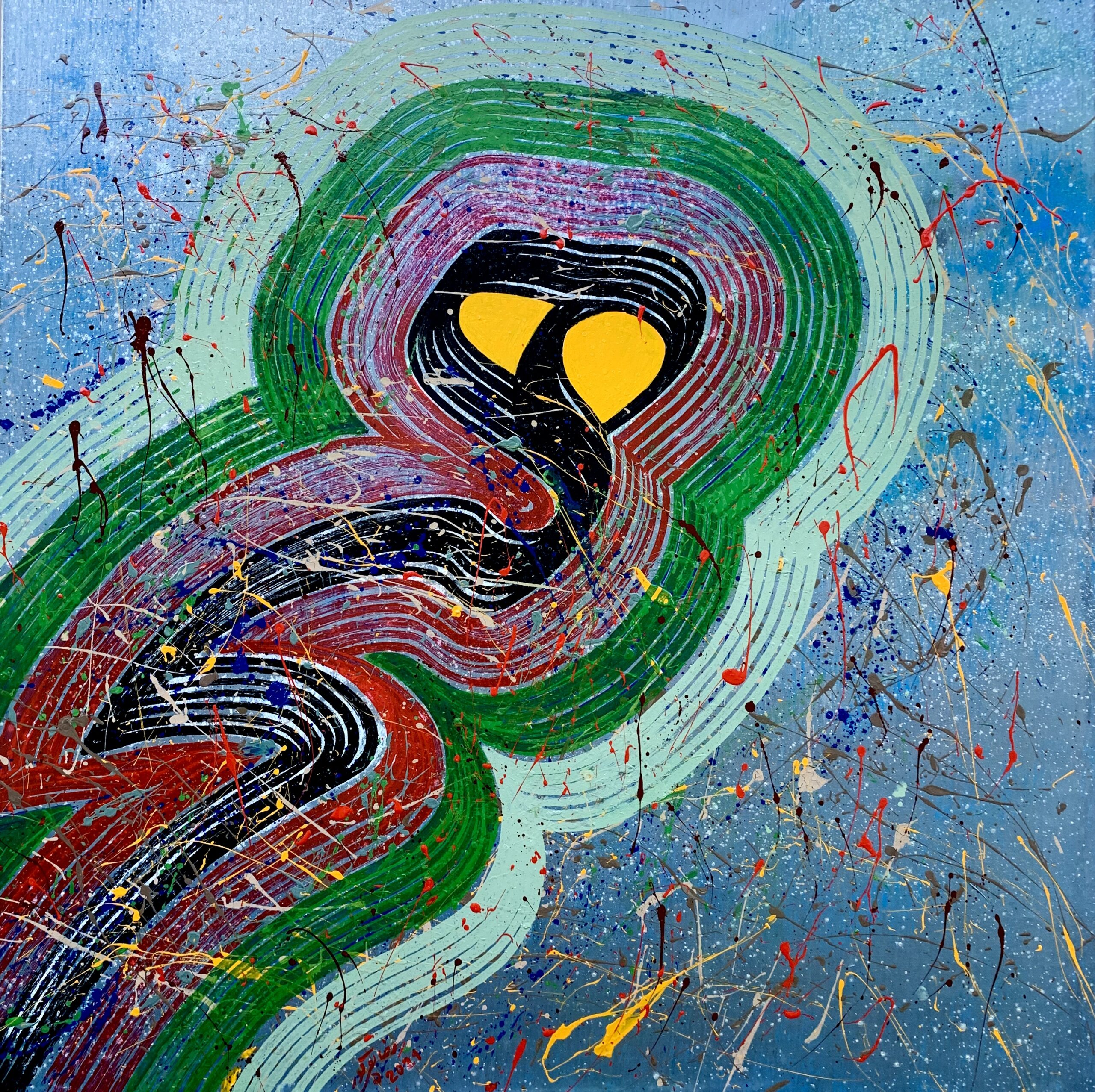 Untitled, calligraphy-painting inspired by nature and abstract expressionist paintings; a combination of modern paintings and black practice (siyah mashq in Persian), date: 2016, medium: acrylic & oil on canvas, size: 130*130 cm